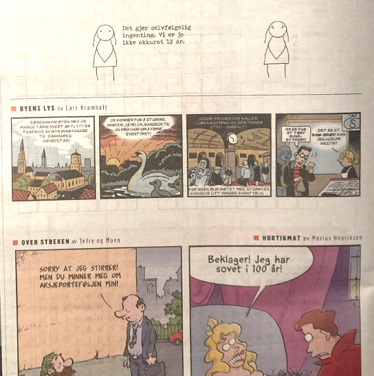 “Paradokset er, at i en verden, hvor alt kan deles på tværs af sprog, grænser og medier, ser ingen længere de samme tegneserier. Byens lys fortjener ellers at være en international avisstribe, ligesom – nu nævner vi bare i flæng, Garry Trudeaus Doonesbury, som den også ligner, bortset fra, at Byens lys er morsommere.”